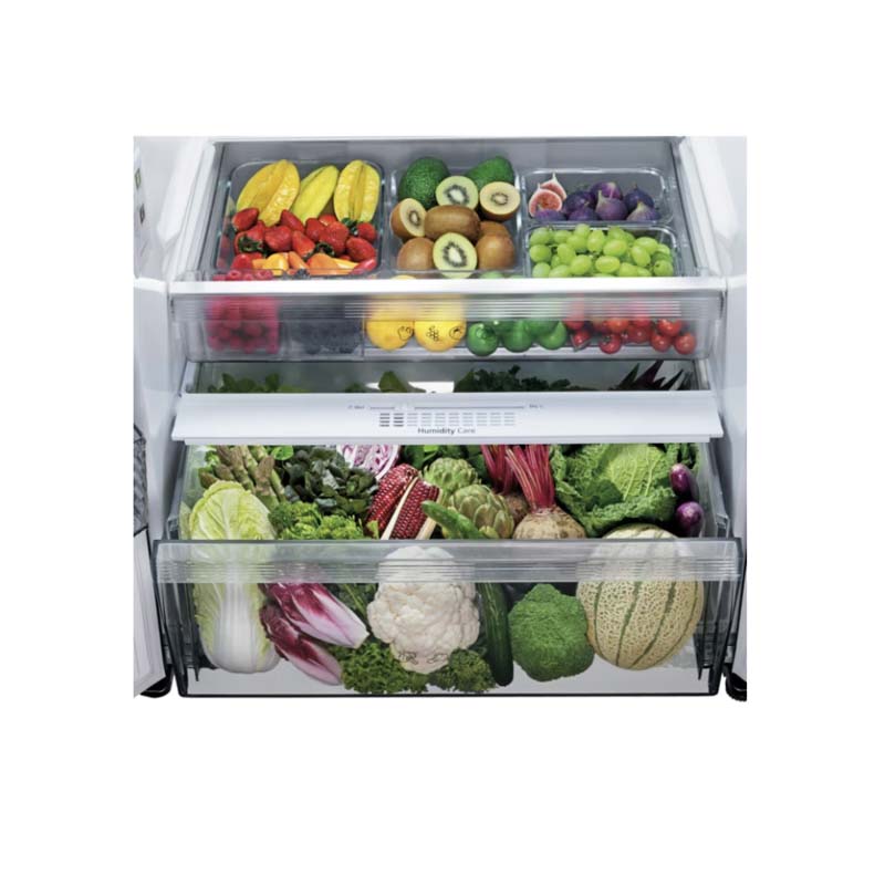 Bên trong có bộ điều khiển nhiệt độ độc lập, cho phép điều chỉnh linh hoạt tùy theo lượng rau củ lưu trữ. Thiết kế ngăn kép (trên – dưới) giúp phân loại thực phẩm dễ dàng. Đồng thời mở rộng không gian chứa đựng.