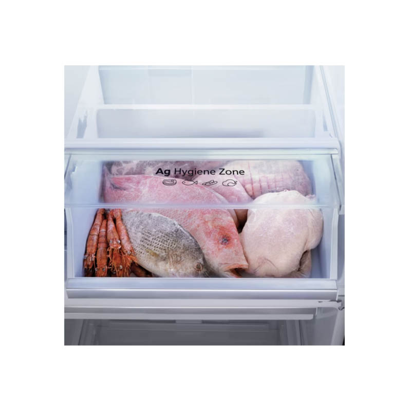 Ngăn Ag Hygiene Zone được bố trí riêng biệt bên trong ngăn đá, có tích hợp tinh thể bạc giúp loại bỏ mùi hôi từ thực phẩm như cá, thịt tươi sống. Điều này giúp ngăn ngừa tình trạng lẫn mùi giữa các ngăn tủ và giữ vệ sinh cho toàn bộ không gian bảo quản.